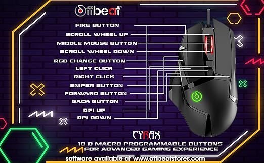 - 10D MACRO PROGRAMMABLE BUTTONS: The mouse is equipped with robust 10D macro programmable buttons. Software available on website (www.offbeatstores(dot)com)