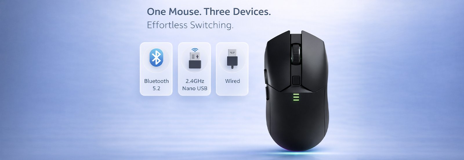 | Connectivity Modes | Bluetooth 5.2, 2.4GHz Nano USB, Wired |