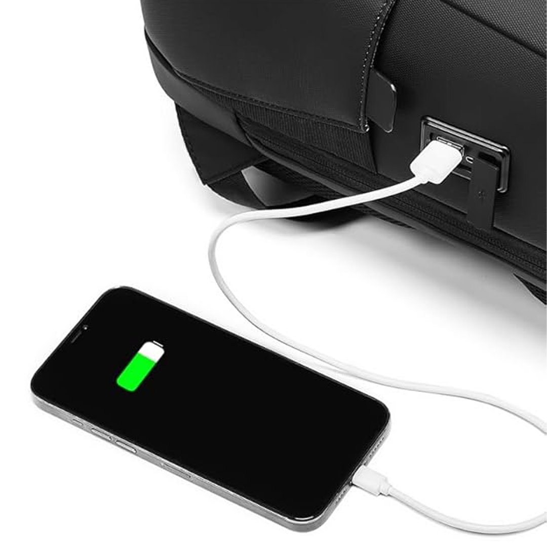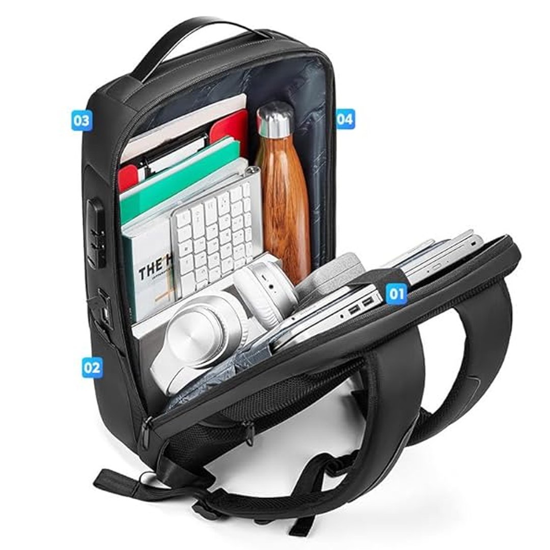 ✈ {LUXURY LIVES IN THE FINER DETAILS} - Premium Oxford Eco-friendly material, extremely durable waterproof easy to clean. Durable recycled fabric that is made from rPET, better TEAR, SCRATCH AND WATER RESISTANT for protection while also being environmentally friendly. ✈ {ANTI-THEFT SECURITY} - This laptop backpack has a combination lock located on the side of the bag with a recessed design to protect your precious personal items. The lock uses a mechanical lock cylinder and is simple to use. ✈ {SUPERIOR REINFORCEMENT}: - The backpack is sturdier as the laptop compartment has sponge around the base and One-piece spring Shell for double protect your laptop against drops, accident impact and dampness. With a hidden anti-theft pocket on the back cares for your valuable items from thieves. ✈ {TYPE C & USB CHARGING PORT} - The laptop bag comes with a charging port you can link your phone to and easily charge during outdoors and travel. Place your power bank inside the bag and connect your phone to the outer port (built-in charging cable inside). Please note that this travel bag doesn't power itself, usb charging port only provides easy access to charge. ✈ COMFORTABLE AND PRACTICAL} - The travel backpack has 12 independent pockets for your well-organized items. TSA approved, exclusively designed and sized for air travel. External USB and headphone jack with built-in charging cable provides convenient connection of your mobile phone and other electronic devices.